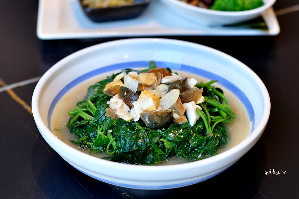 地瓜葉搭配皮蛋是很經典的台菜料理,這裡的比較特別,還加了鹹蛋
